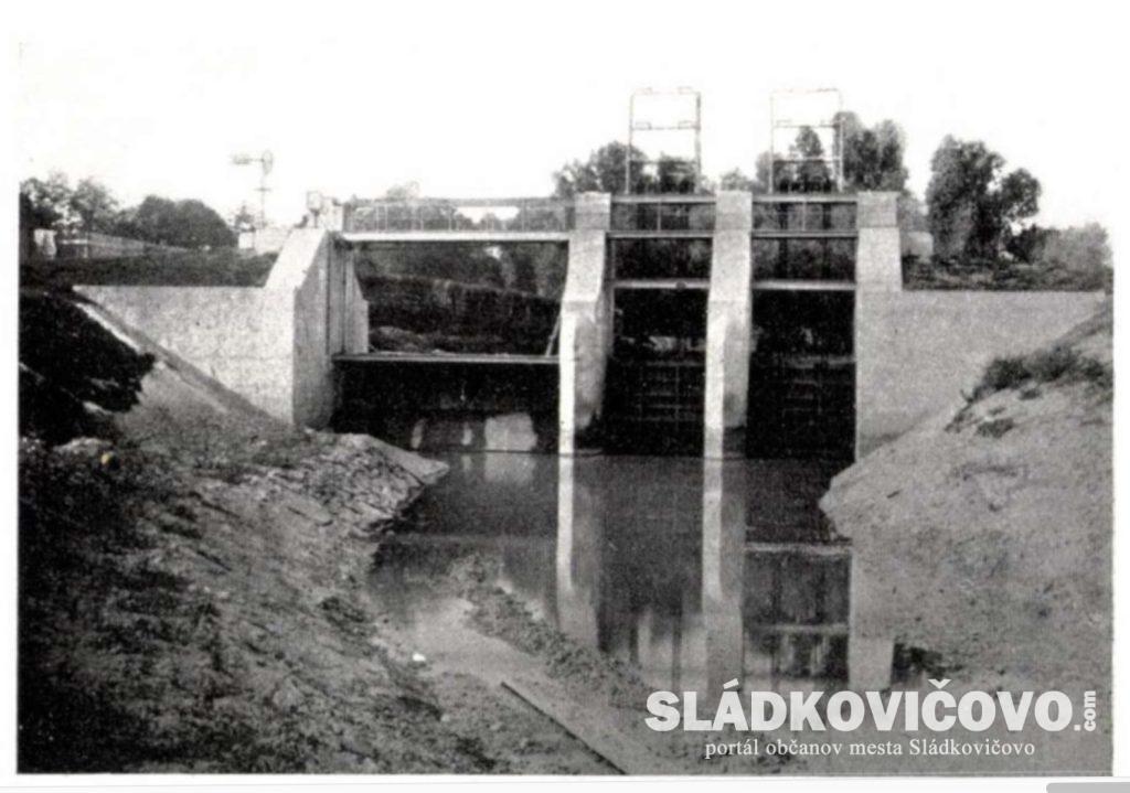 Na tretej fotografii je protipovodňový 49 metrov široký prepad zo železobetónu na pozadí s výrobnými halami cukrovaru a budovami skladu náhradných dielov a vrátnicou s ambulanciou závodného lekára.