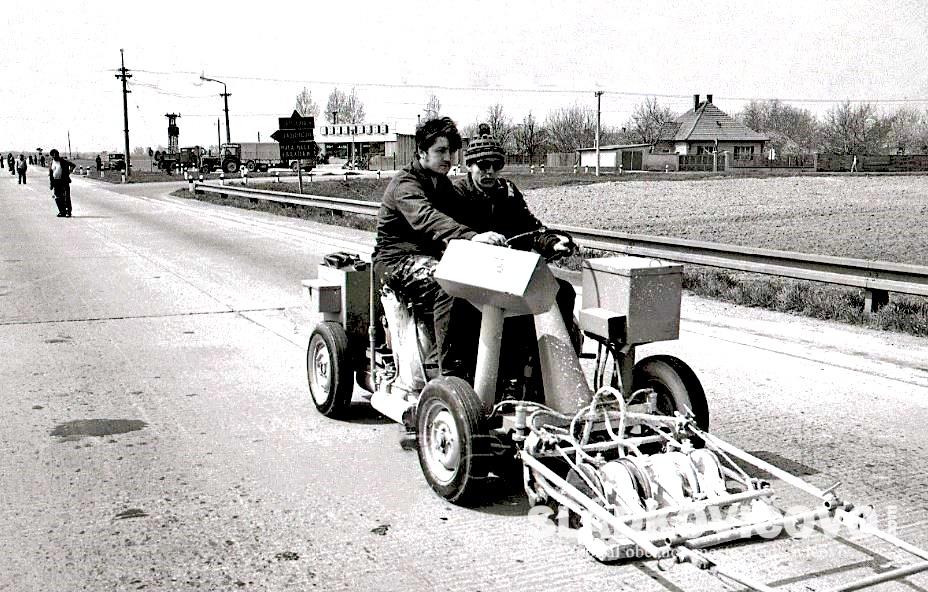 Fotografia bola zhotovená dňa 5. mája 1971 pri práci s vyznačovaním deliacich čiar na ceste 1. triedy Senec – Sládkovičovo. Na pozadí je vidieť starý Dánošský transformátor, obchod Potraviny – vtedy ešte novostavbu a (v tom čase) prvý rodinný dom s garážou v smere na Malú Maču. Na parkovisku pred obchodom stojí Gazik, Tatra T-141 ťahač, Nákladiak Škoda RTO-Trambus a traktor Zetor Super 50.