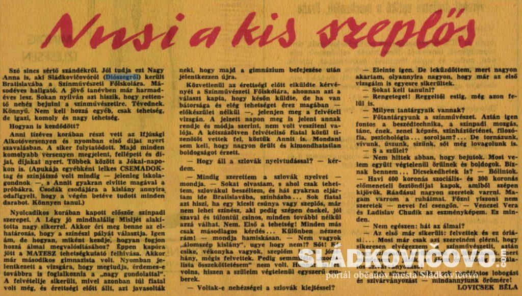 V týždenníku A Hét bol dňa 11. augusta 1972 uverejnený článok o našej rodáčke Anna Nagy, Nuši. Pridávam autentický text, ako bol uverejnený.